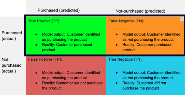 The confusion matrix summarizes how accurately the model had predicted customers who had and had not purchased the product. For example, it can show how many people it had correctly (TP) and incorrectly (FN) classified as making an actual purchase. You will need to decide a threshold value that you will use to evaluate the results on the confusion matrix based on your business problem. You can define the threshold by finding the right balance of the tradeoff of either too many false positives or too many false negatives.