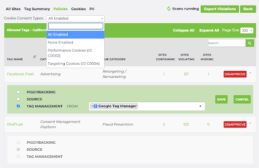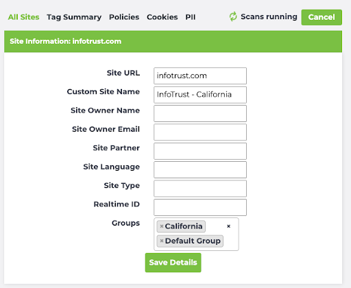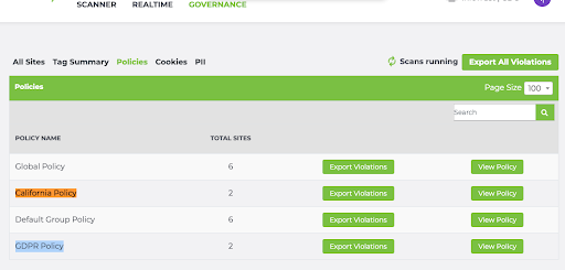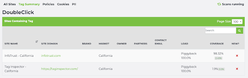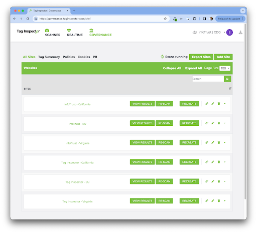 And you’ll see that the California Policy contains two sites (infotrust.com and taginspector.com; each scanned from the California region) as well as the GDPR Policy (infotrust.com and taginspector.com; each scanned from France, a GDPR country.)