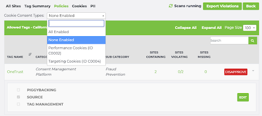 For example, in this same California group, if we scroll down for the None Enabled policy, we see in the Sites Containing column that one site fires Bugsnag, two sites fire DoubleClick, and one site fires Facebook Pixel.