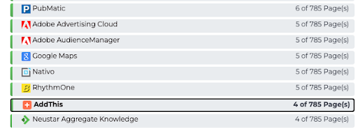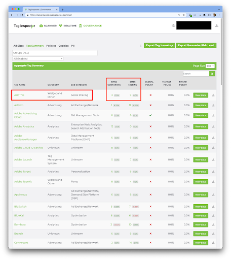Let’s take the specific example of AddThis, an erstwhile popular adtech platform that recently bit the dust. If you are an organization with a portfolio of sites and are keen on ensuring your sites are clean and firing only legitimate tags, by leveraging the Governance module functionality of Tag Inspector, you can easily at a glance see all of the tags that are firing on your portfolio of sites with the “Tag Summary” tab in the Tag Inspector’s Governance module: