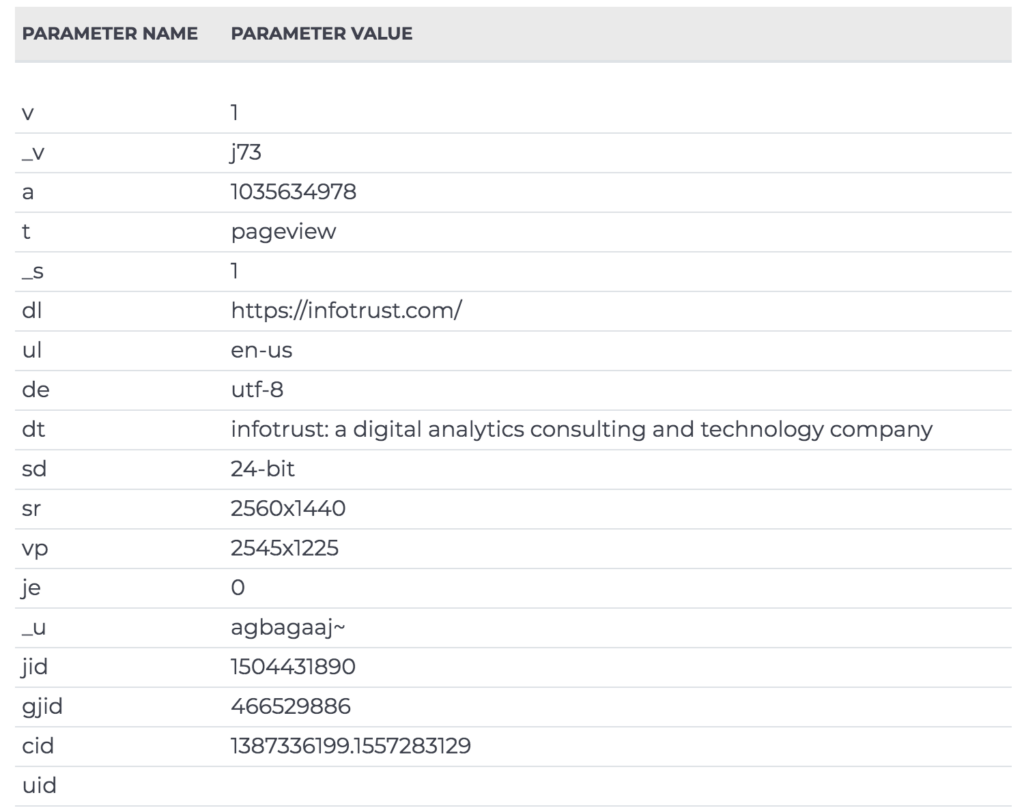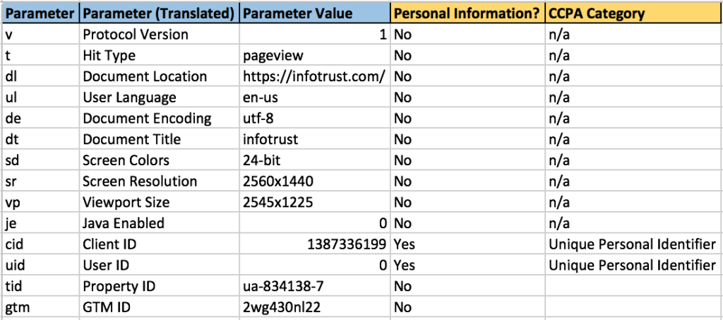 The easiest way to break out and identify the data points that are “Personal Information” is to take our parsed-out requests from Step 3 and then go through each data point for each platform. You can also reach out and request this information from each of the platforms you are leveraging on your site. If going about it yourself, here’s an example for how we (Tag Inspector) work with clients to map this out with a Google Analytics request: