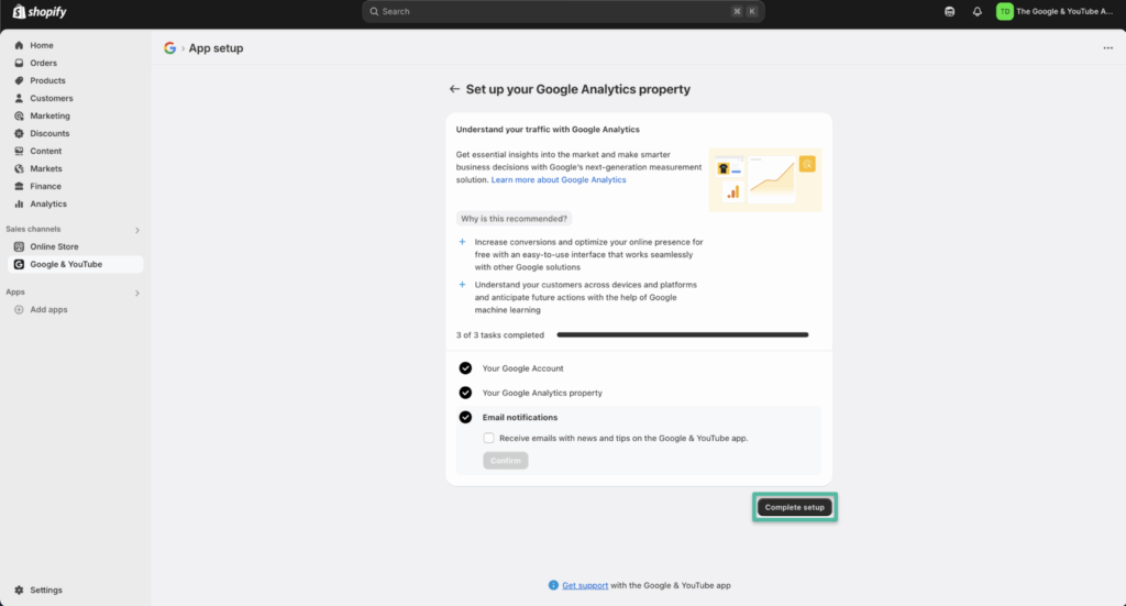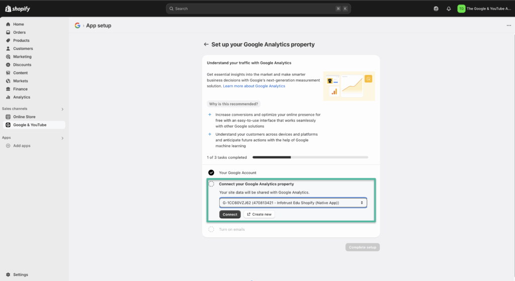 - Connect Your Google Account: Once installed, navigate to the Google & YouTube app within your Shopify admin. You will typically be prompted to connect a Google account. This account should preferably have administrator access to your Google Analytics property.