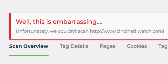 If you use Tag Inspector to scan a URL for tags and receive a message that we “couldn’t scan” your website, like below, here are a few things to consider.