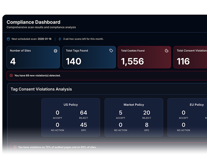 A centralized source of truth to provide confidence in your documented and defensible website privacy compliance. Aggregate tag/cookie inventories, consent policy management, and scheduled audit trails for clear understanding of your risk exposure.